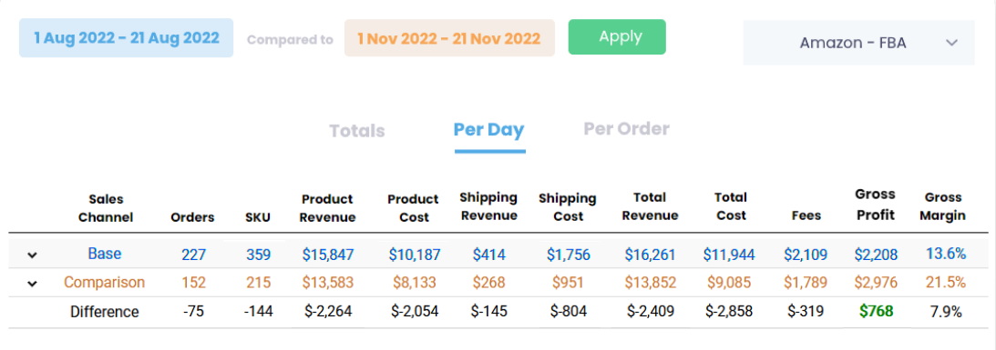 Identify your most (and least) profitable products, brands and suppliers after all COGS and fees have been accounted for. Compare the average profitability of one SKU across multiple sales channels.